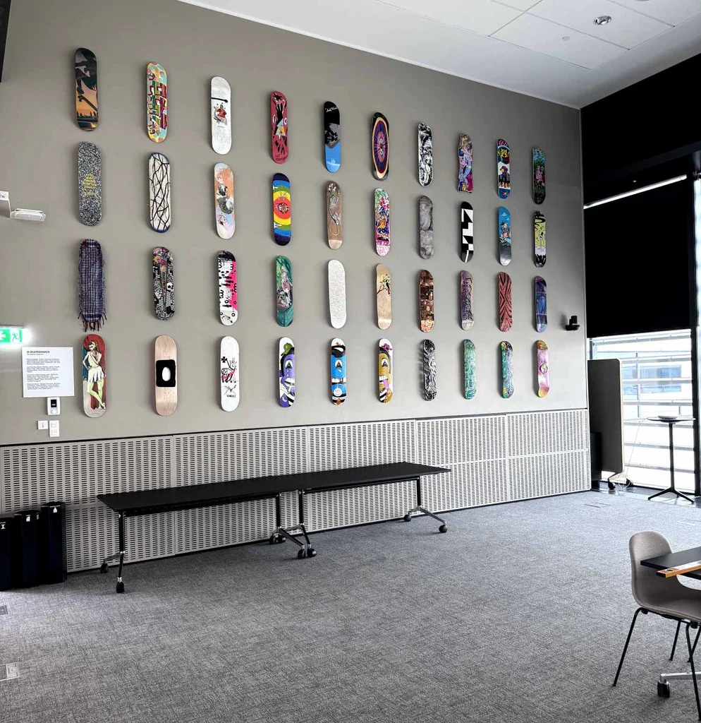 A great example is our collaboration with Netcompany, where we curated art for their Copenhagen headquarters, including 40 unique skateboard pieces. This shows how art from The Brask Collection can transform a workspace and inspire creativity.